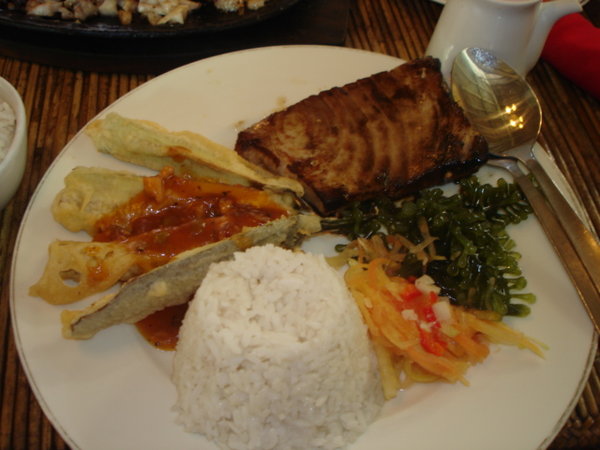 Actually, once we entered to this place, we asked if we would like to have a seat either on chairs or on the floor. We decided to seat on the chairs. We ordered individually and as I checked the menu, I ordered a Blue Marlin Choice Catch (PHP200). The Choice Catch (based on the menu) is a rice dish served with veggies of the day and choice of either Blue Marlin (my choice), shrimps, Tuna Steak or Fish Cordon Bleu. Veggies for the day (on that day) was fried eggplant tempura style and seaweed with tomatoes. It was so good and delicious. It was a healthy meal too. Some of them ordered other food. By the way, most of the food served were sea foods.
